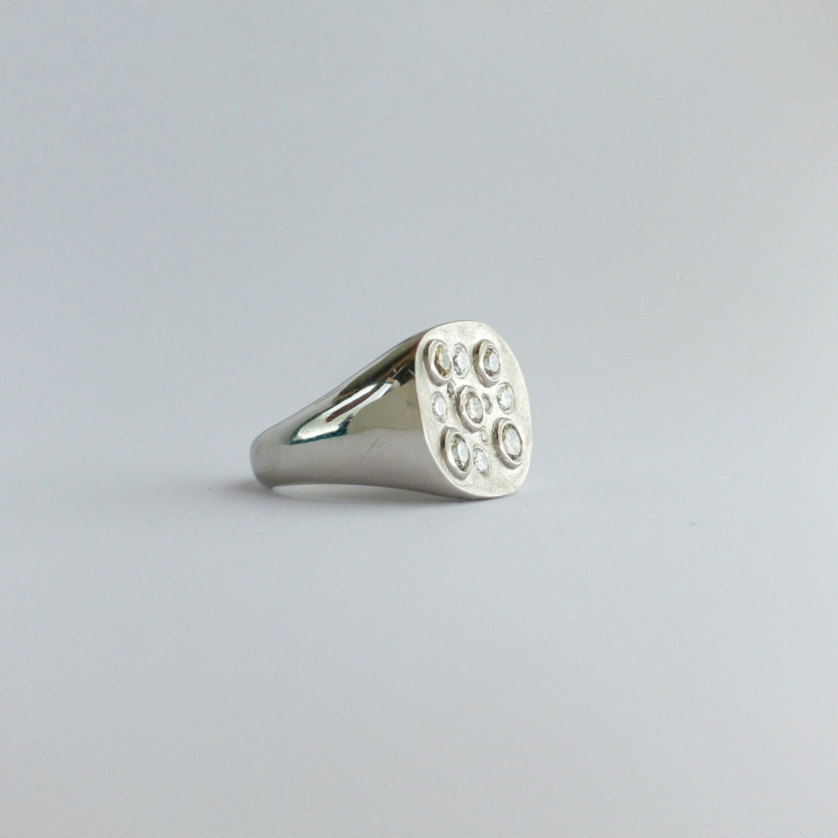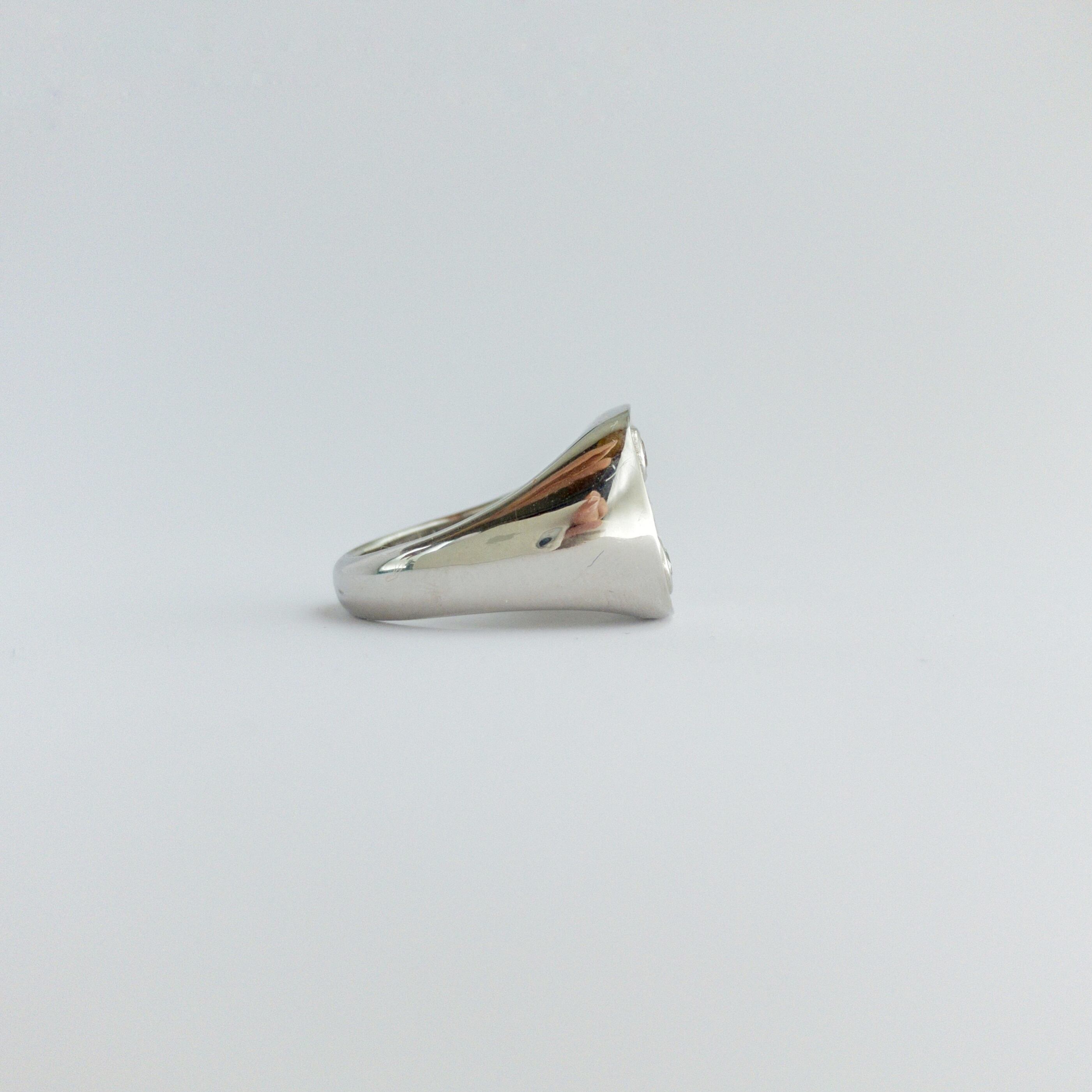 ダイヤを留めているリング正面のテーブル面は反射を抑える艶消し(梨地風)仕上げとし、側面はテーブル面を際立たせるため鏡面仕上げとしました。