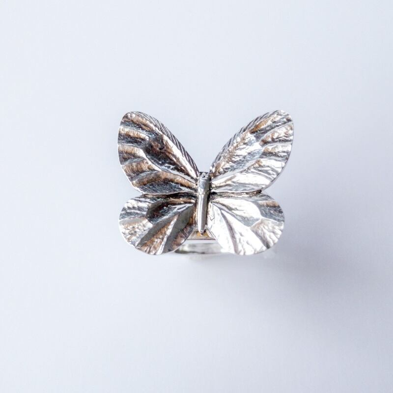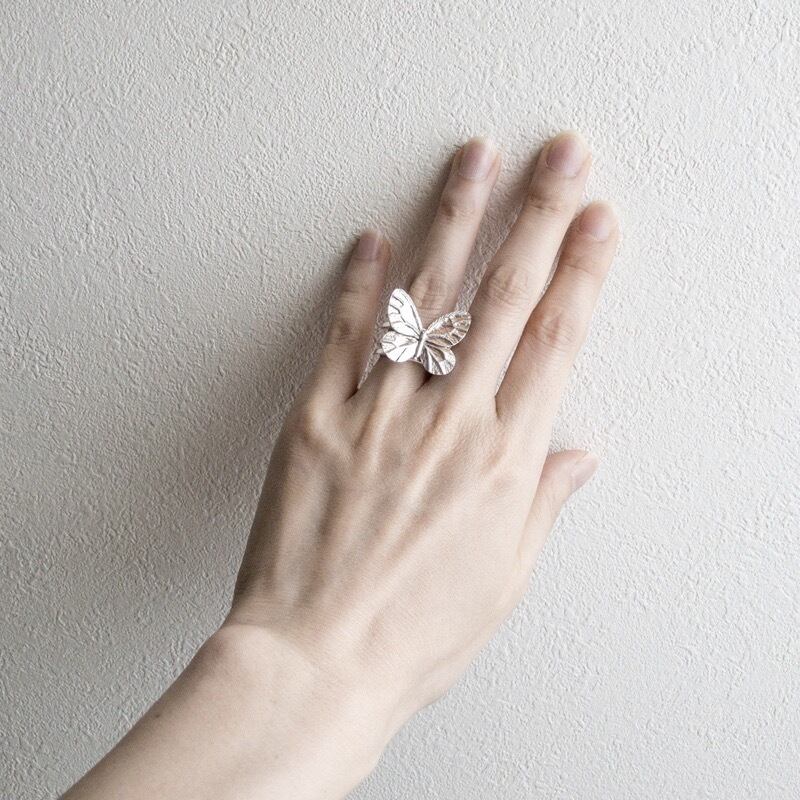 美しい蝶が特徴のシルバーリング、Butterfly silver ring(10号・サイズ直し可能)。手元を優雅に飾るこのアクセサリーは、和彫りによる繊細な蝶の羽のディティールが魅力です。蝶の美しさを表現した彫刻が、指元でひと際目を引き、楽しさと華やかさを添えます。