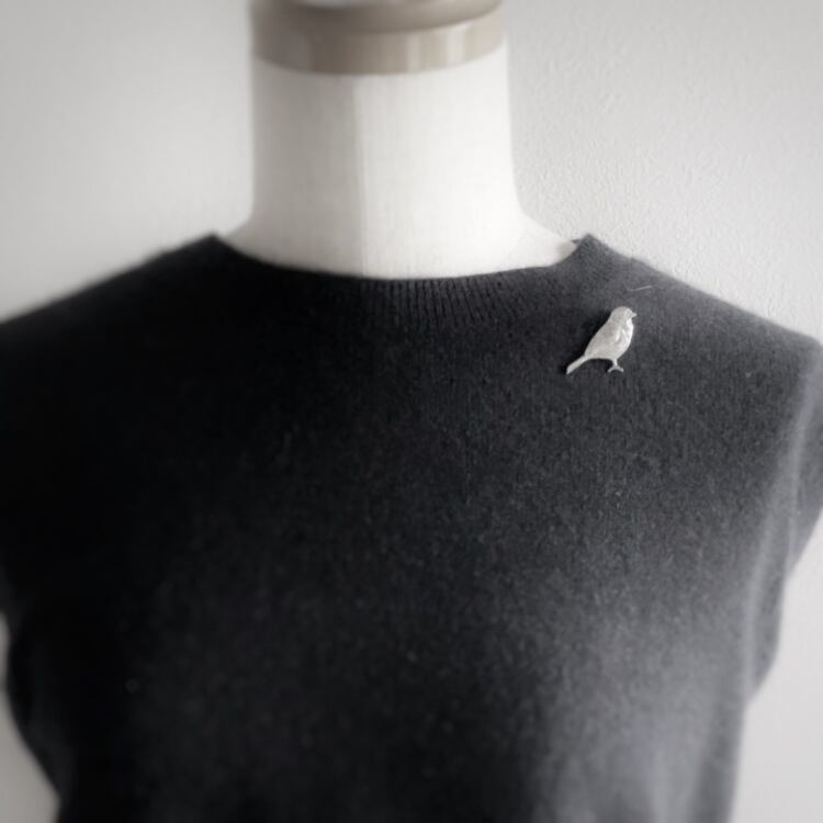 和彫りで制作された小さな鳥のシルバーブローチ、Silver brooch tori no.70002。繊細なフォルムが特徴のこのピンブローチは、細かな和彫りの技術によって生み出された美しいディテールで、見る人を笑顔にします。