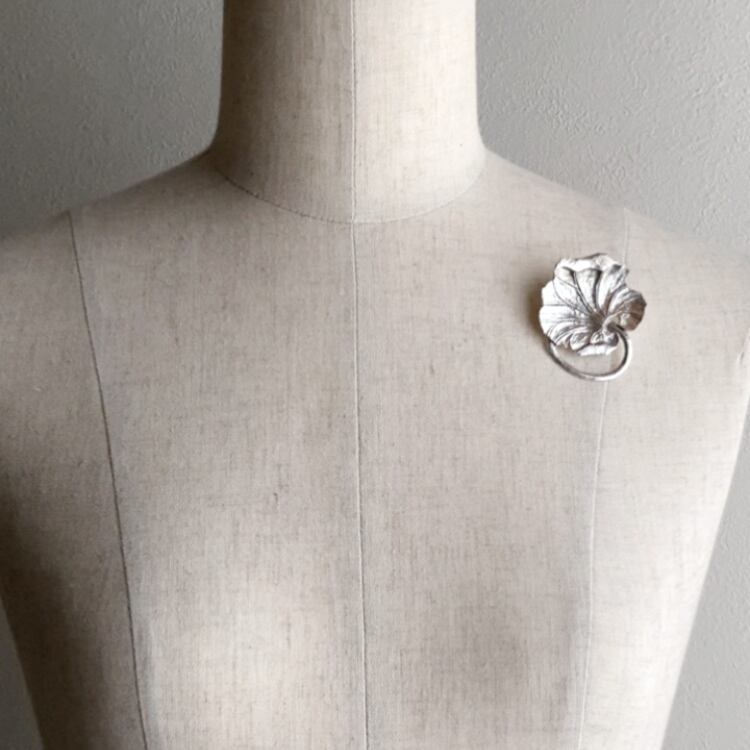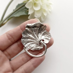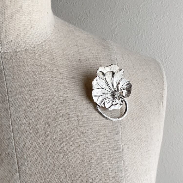 和彫りで表現された蓮の葉をモチーフにした「Lotus leaf silver brooch no.70006」。優雅な曲線と細やかな彫刻が特徴で、シルバーの質感を活かした美しい仕上がりです。蓮の葉は、清らかさと繁栄の象徴として多くの人に愛されています。